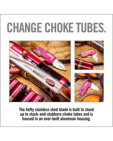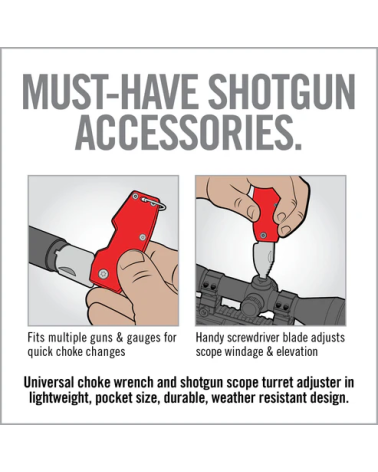 Cet outil de poche est la clé de choke la plus polyvalente jamais créée. Elle s'adapte à la plupart des marques et à tous les calibres, du .410 au 10 gauge. La lame robuste en acier inoxydable est conçue pour résister aux tubes de choke coincés ou récalcitrants et est logée dans un boîtier en aluminium surdimensionné. Elle est également équipée d'une lame de tournevis pratique, idéale pour ajuster les tourelles de lunette ou effectuer des réparations.