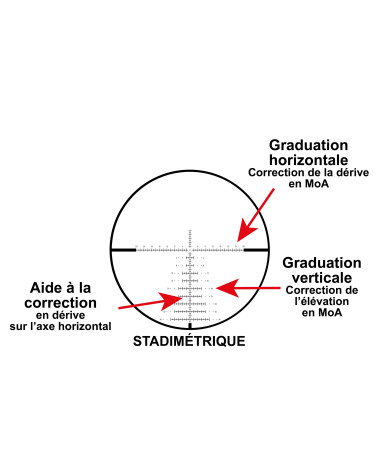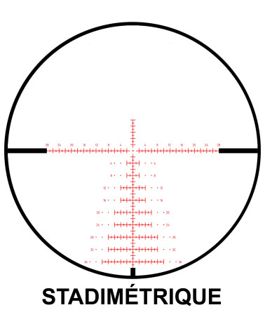 Le réticule CBR de type stadimétrique présente de multiples graduations en dérive ainsi qu'en élévation correspondant au nombre de MOA pouvant être appliqué à une correction d'impact en cible.