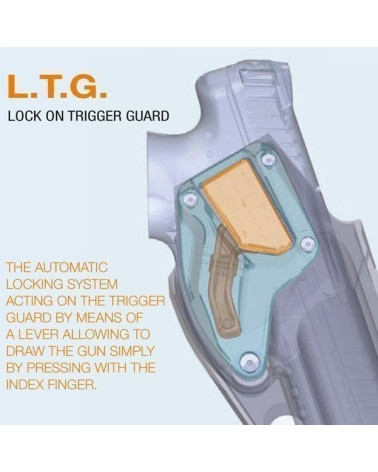 L'holster LTG-Duty est un étui de transport kydex de niveau 2 pour Beretta 98 92F (MAS G1, PAMAS). Un appui de l'index libère la sécurité pour extraire l'arme de l'étui. Il est fourni avec un déport bas S-Closer 3x120°.