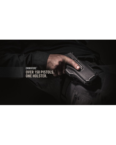 Le Blackhawk Omnivore est un holster universel conçu pour s'adapter à plus de 150 modèles de pistolets semi-automatiques équipés d'un rail accessoire. Doté d'un mécanisme de rétention active, il se verrouille sur un dispositif de fixation sur rail (RAD) ou sur une lampe spécifique, sans s'attacher au cadre de l'arme.