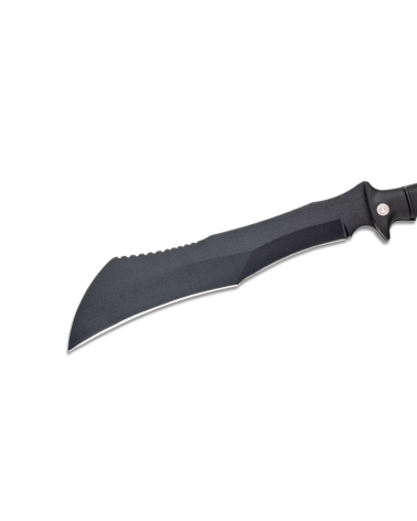 Le manche Tactiprène assure une prise en main ferme et confortable, même en conditions humides. La garde protectrice et le finger choil offrent une sécurité optimale lors des manipulations rapprochées, tandis que le pommeau débordant permet des frappes précises et puissantes.